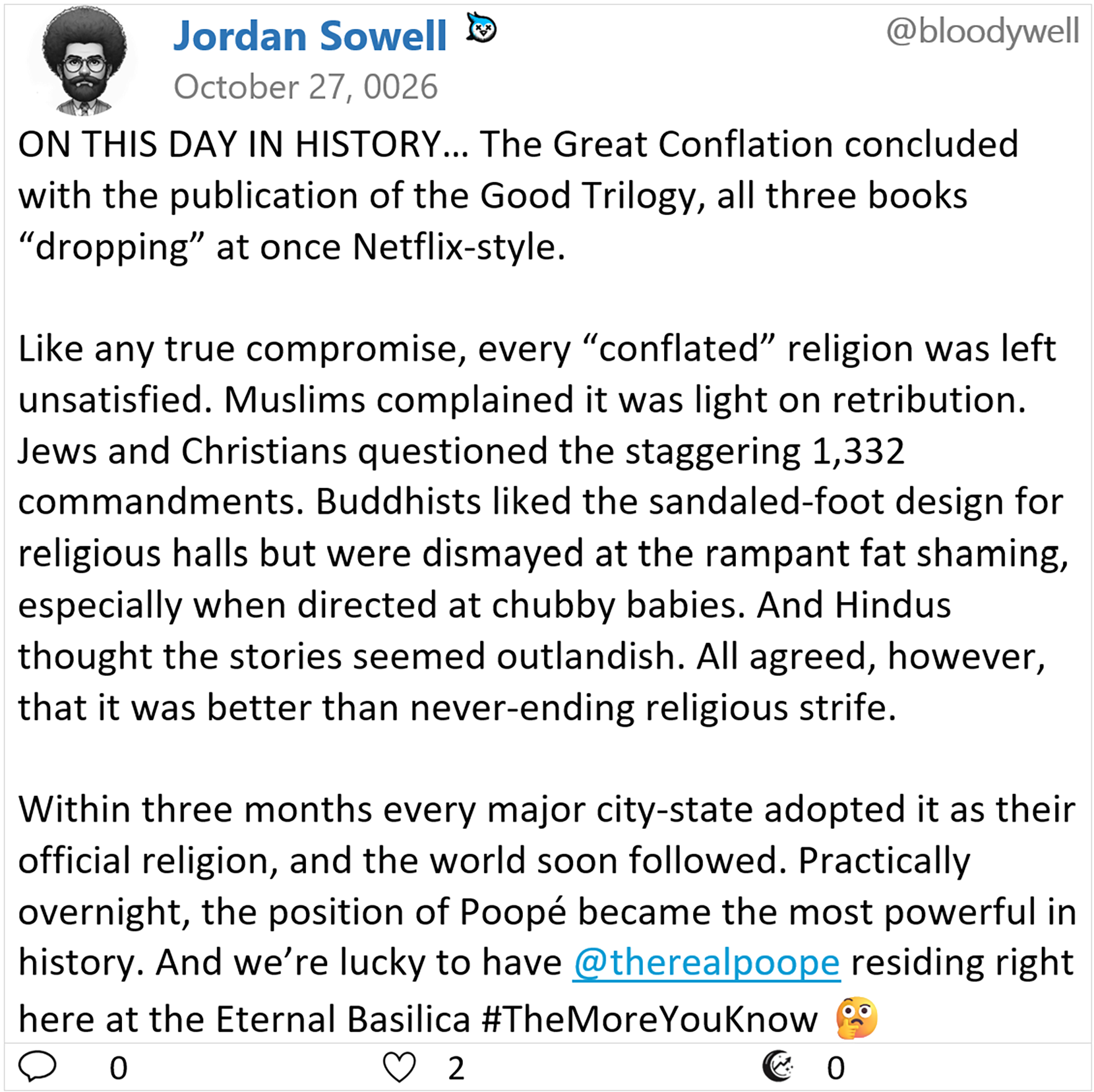 “But having kids was not at all like They had expected,” the Poopé continued grimly. “It sucked—as the parents among us can attest. Mother and Father began to bicker, blaming each other whenever Their flock behaved like sassy assholes. And lo, the teenage epoch was the worst. Banging was no longer on the table. Instead, there were chore lists, pick up and drop offs, play dates—the type of shit that would make even the prime divinity cross…”